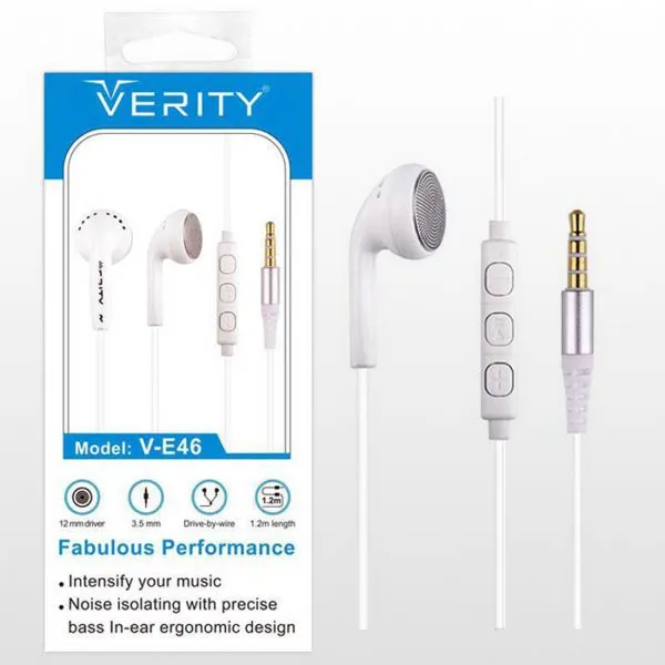 هندزفری وریتی Verity V-E46 با قابلیت پاسخگویی به تماس است هندزفری ها در زمینه های مختلف از جمله بازی، تماشای فیلم، گوش دادن به موسیقی و … استفاده میشود. این ایرفون و هندزفری از طریق جک ۳٫۵ میلی متری به لپ تاپ، تلفن همراه و یا.. متصل می گردد و امکان کم و زیاد کردن صدا و قطع و وصل آهنگ را نیز دارد. هندزفری ها معمولا علاوه بر صدایی با کیفیت بالا, از وزن کمی نیز برخوردار است و شما کاربران می توانید بدون خستگی و ناراحتی به مکالمه با دوستان خود بپردازید.